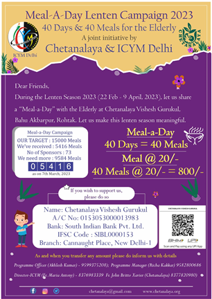 It is a joint venture of Chetanalaya and ICYM Delhi to support the elders at Chetanalaya Vishesh Gurukul - Home for the Elderly at Rohtak. 40 Days and 40 Meals